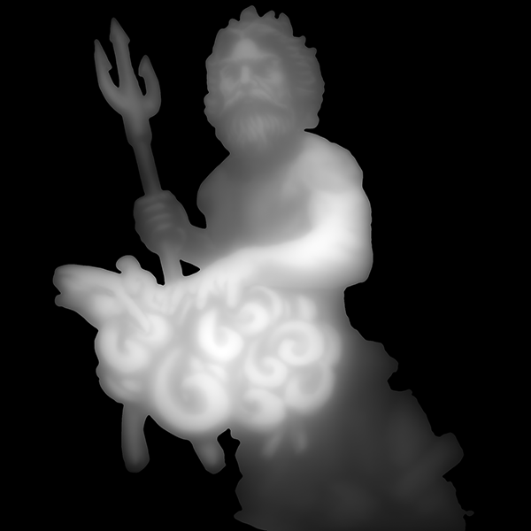 Keeping in mind the painting needed to be done for a height map projection, that meant the parts of the painting that needed to come forward the most (such as Poseidon's arm, his hand and the sheep) needed to have the lightest values. (Height maps are based on values. Black values have no height information, whilst the lighter the value the higher the height).